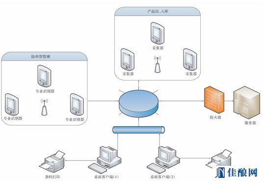 该系统采用C/S模式构建(系统拓扑图设计见图2),实现酒厂对产品的工序信息采集、产量统计、出入库管理、防窜货管理,对每个产品进行身份识别、防窜货管理,记录异常状况(不合格,退货等),分析beplay正规 形成所需要的报表,通过报表对不同条件的beplay正规 进行统计管理。通过beplay正规 分类存储快速查询单品或批次产品详细信息,减轻操作员在Excel表格中的beplay正规 整理与维护工作量。将各项采集回的beplay正规 信息整合处理,消除各beplay正规 单独列表形成的信息孤岛,提升beplay正规 的利用率。beplay正规 集中存储、用户分享保证了beplay正规 的安全性与稳定性,为企业的生产战略提供准确的beplay正规 依据,减少窜货行为造成的损失。