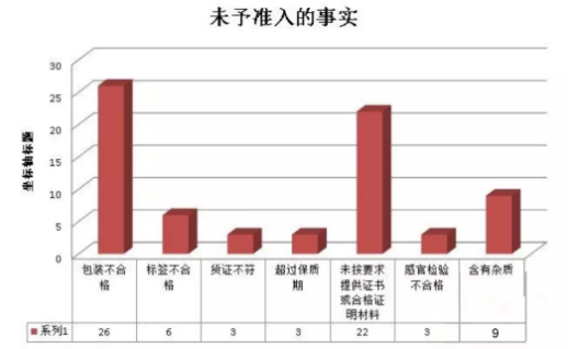 从名单中不难发现,产品未予准入的事实为:包装不合格、标签不合格、货证不符、超过保质期、未按要求提供证书或合格证明材料、感官检验不合格、含有杂质等。但值得注意的是,包装不合格以及未按要求提供证书或合格证明材料两大问题较为突出,分别达到了26及22批次。