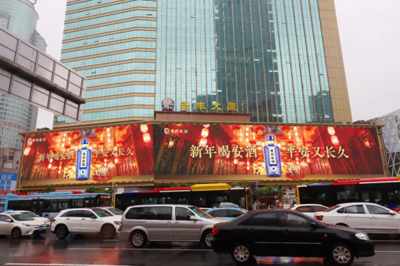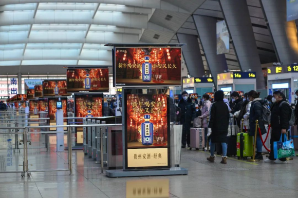 在这个春节,贵州安酒的营销关键词是“平安”。以“新年喝安酒,平安又长久”为主题的贵州安酒广告大片在国内400多个高铁站、近6000块屏幕,以及全国多个城市地标建筑大屏上“霸屏”式投放、矩阵式辐射全国,仅单日曝光量就超百万次。