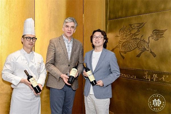 上海新荣记(BFC外滩金融中心店)主厨马师傅(左)、魔爵酒庄首席执行官兼首席酿酒师恩里克·蒂拉多先生(中)、首位华人侍酒师大师吕杨先生(右)于品鉴现场