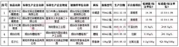 在山东省食药监局公布的不合格产品名单中,烟台龙驿庄园葡萄酒有限公司生产的蛇龙珠干红葡萄酒、烟台蒙巴顿葡萄酒有限公司生产的赤霞珠干红葡萄酒被检测出酒精度不合格,烟台张孚酿酒有限公司生产的张孚干红葡萄酒被检测出干浸出物不合格,烟台市醴隆酒厂生产的烟台白乾被检出总酸不合格,莱阳市蔡春食品有限公司生产的瓜子仁被检出过氧化值超标。
