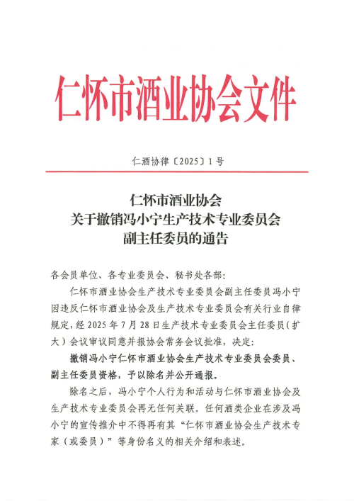 7月28日,仁怀市酒业协会发布通告称,撤销冯小宁仁怀市酒业协会生产技术专业委员会委员、副主任委员资格,予以除名并公开通报。