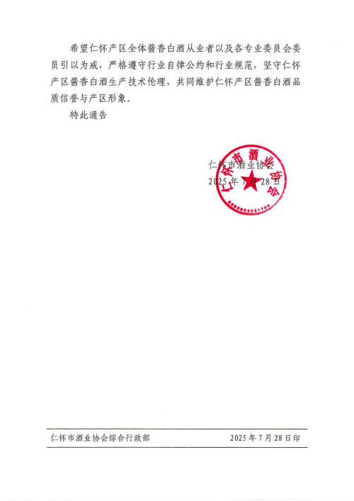 这是6月央视曝光后,仁怀整治酱酒乱象的延续。一周前,仁怀酒协常务副会长焦林强调:“全体会员须以敬畏之心守护品质,协会将配合监管部门坚决清理害群之马,捍卫产区声誉。”
