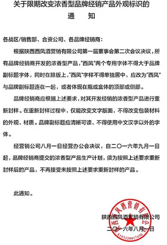 8月1日,陕西西凤酒酒营销有限公司召开了第一届董事会第二次会议,据了解,会议形成一致决议:所有品牌经销商开发的浓香型产品、“西凤”两个专用字体不得大于品牌副标题字体,同时在排版上,“西凤”字样不得单独居中, 应改为“西凤”与品牌副标题连在一起,或者体现在瓶或盒体的顶部或侧……
