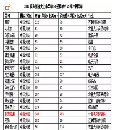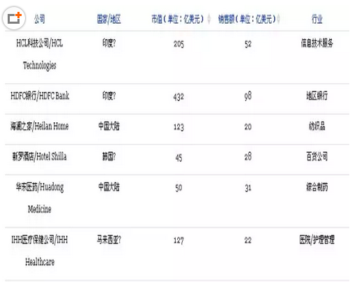 这些公司是《福布斯》从1116家亚太地区上市公司中挑选出来的,年收入或市值至少达到30亿美元,而且剔除了负债过高或者政府持有一半以上股份的公司。
