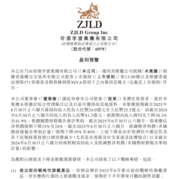 据盈利预警公告显示,今年上半年,珍酒李渡录得收入为24亿-25.5亿,预期将同比下降38.3%-41.9%;股东应占净利润预期下降23%-24%,经调整净利润预期下降39%至40%。