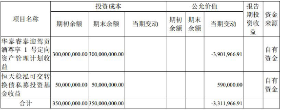 中国经济网记者查看半年报中上半年迎驾贡酒的投资成绩单,发现,上半年,公司3亿元投资华泰睿泰迎驾贡酒尊享 1 号定向资产管理计划收益,这一投资公允价值减少了390万;迎驾贡酒5000万元投的恒天稳泓可交转换债私募投资基金收益公允价值增加了59万。两项3.5亿元的投资合计公允价值减少了331万元。