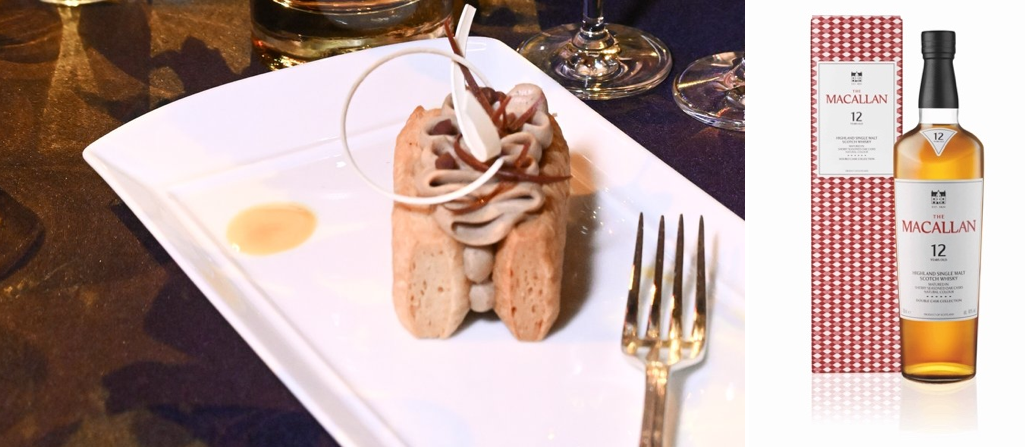 麦卡伦双雪莉桶12年单一麦芽苏格兰威士忌,散发着奶糖、苹果与太妃糖般的温润甜香,口感柔顺细腻。与之相配的,是一款中西合璧的红豆千层酥——层叠酥皮间夹着红豆奶油,佐以南瓜酱、番石榴雪葩与一缕花果风味的威士忌点缀。口感时而酥脆轻盈,时而甜柔细腻,仿佛美人在月下林间轻歌曼舞,尽抒诗意情怀。