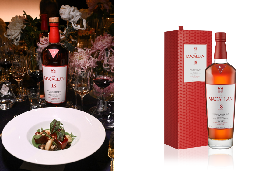 麦卡伦经典雪莉桶18年单一麦芽苏格兰威士忌,酒体饱满馥郁,散发着深邃的干果甜韵与香料气息。它与雪龙和牛(精选低脂牛肩肉)相搭配,在风味上形成优雅的呼应——威士忌中复杂的木质与干果香调,不仅衬托出和牛醇厚细腻的本味,也与玫瑰腐乳的东方发酵香气、朝鲜蓟的清雅及野生蘑菇XO酱意大利饺子的浓郁馅料和谐交融,共同演绎出一场层次丰富、东西合璧的味觉交响。