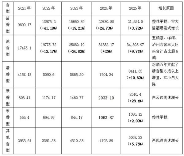 表2:后疫情时代(2021–2025年)白酒各香型价值变化、增速变化(单位:亿元)