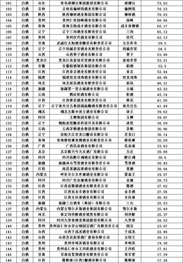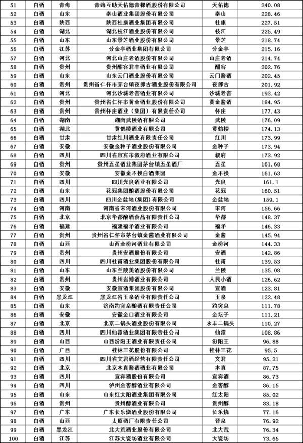 华樽杯第十七届中国酒类品牌价值200名单如下: