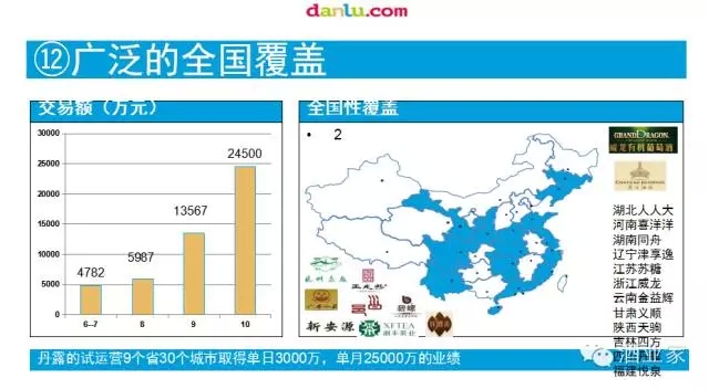 张伟表示,目前丹露已经实现了全国性覆盖,包括湖北人人大、河南喜洋洋、湖南同舟、辽宁津享逸、江苏苏糖、浙江威龙、云南金益辉、甘肃义顺、陕西天驹、吉林四方、四川丹露、福建悦泉等在内的大商加盟。丹露的试运营9个省30个城市取得单日3000万,单月25000万的业绩。