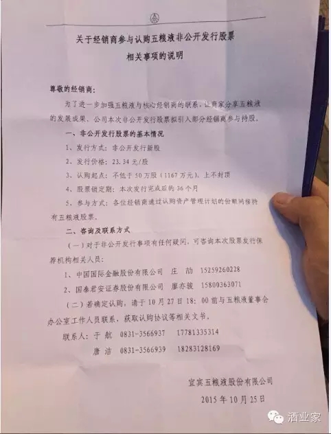 说明显示,此次经销商参与非公开发行股票,发行方式为非公开发行新股,发行价格为23.34元/股,认购起点为不低于50万股(1167万元),上不封顶,股票锁定期为本次发行完成后的36个月,参与方式为各位经销商通过认购资产管理计划的份额间接持有五粮液股票。