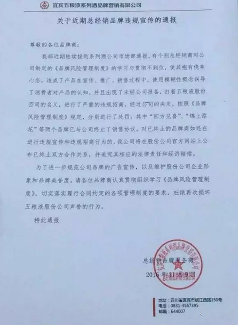 宜宾五粮液品牌营销公司通报称,有个别总经销商对《品牌风险管理制度》的学习与贯彻不到位,使其抱有侥幸心态,造成了产品的宣传、推广、销售过程中,使用模糊性概念误导消费者对产品的认知,并且出现了未经公司报备,打着五粮液股份公司的名义,进行了严重的违规招商。对此,督促经营五粮液系列酒的广大经销商贯彻组织学习《宜宾五粮液系列酒品牌营销有限公司品牌风险管理制度》,杜绝再次损坏五粮液股份公司声誉的行为。