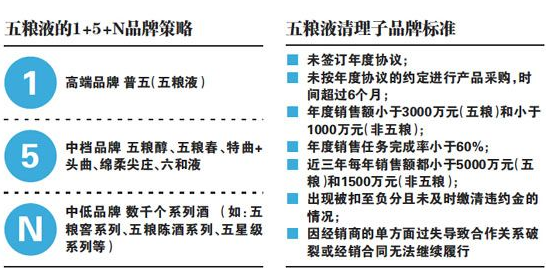 据悉, 今年6月,五粮液连发两份文件,要求各部门品牌运营商在6月30日前将全国性卖场和地方大卖场的违规宣传,包括宣传用语、价签、价格等整理完毕。今年7月,宜宾五粮液系列酒品牌营销有限公司再次下发相关管理文件,对旗下经销品牌进行整顿。主要对“五粮字头”和“非五粮字头”的经销品牌年度销售额做了明确规定。