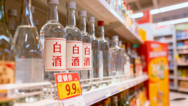 超市货架上,一瓶贴着“大促销”标签的白酒,售价仅为9.9元,旁边是价格高出几倍甚至几十倍的品牌酒。两位顾客驻足,一位毫不犹豫拿起低价酒,另一位则犹豫不决。
