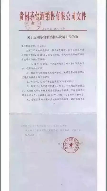 文件显示:茅台销售公司为保证正常的市场供应,满足消费者需求,鉴子公司生产及运输能力的制约,经12月9日会议研究,决定对近期茅台酒销售及发运工作做如下安排: