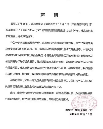 近日,有网友在社交网络上发帖投诉唯品会卖假酒的问题,称其近期在唯品会的一次酒类促销活动中购买的茅台酒质量有问题。12月15日唯品会发表声明,对此事件做出了官方回应。
