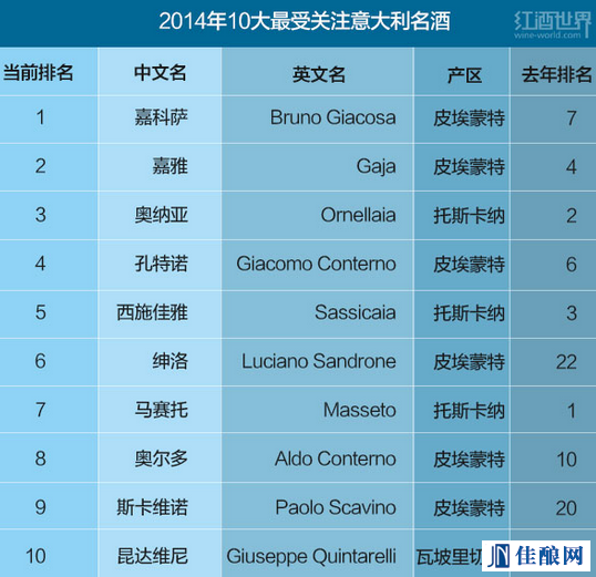 在苏富比拍卖会公布的2014年年终最受关注名酒排名中,尽管罗曼尼·康帝(DRC)仍牢牢占据着首位,而且前10名无一款来自意大利,但是意大利酒却也表现出极大的上升势头,尤其是在美国的强劲需求之下更是表现出色。苏富比葡萄酒拍卖亚美区总裁钱礼智(Jamie Ritchie)说:“我们发现,意大利佳酿在纽约最受欢迎,而且一直来都这样。美国买家很欣赏意大利酒,而且对其背后的故事也非常感兴趣。”