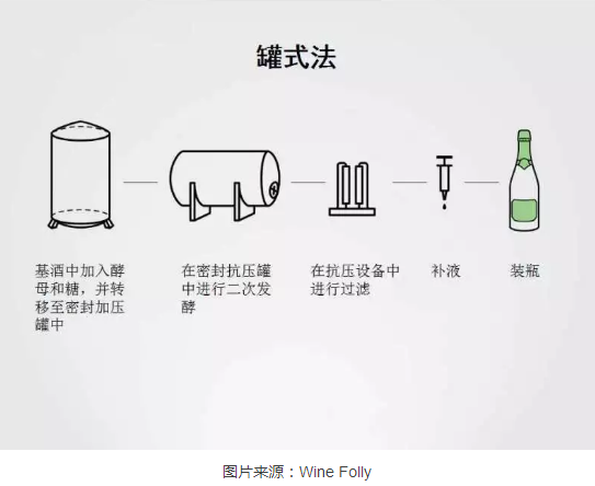 这一方法也因为发明者尤金·查玛(Eugene Charmat)而得名查玛法(Charmat Method)。与传统法在瓶内进行二次发酵不同,罐式法将二次发酵的场所转移到了密封抗压的大罐中,并且通过过滤的方法除掉酒泥,最终在加压条件下进行装瓶,以防止酒中二氧化碳逸出。