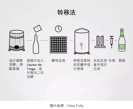 转移法在初期阶段和传统法相同,只是在瓶内二次发酵完成后不进行转瓶处理,而是直接将酒倒入密封抗压罐内,进行澄清后再重新装瓶。这一方法能够节约部分成本,因而被普遍用于新世界起泡酒,如80%的澳大利亚起泡酒都使用转移法酿造。