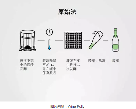 从它的名字就不难看出,这应当是最古老的起泡酒酿造方法了。由于主要被用于酿造法国的德蒂克莱蕾(Clairette de Die),因此它也被叫做德蒂法(Methode Dioise)。在酒精发酵进行到一半的时候降温中止发酵,然后将酒装瓶,在酒瓶里恢复发酵,但不添加任何液体。待发酵产生的二氧化碳压力达到理想水平时,再一次降温终止发酵,并且像传统法一样进行转瓶、除渣,但在除渣过后也不再进行补液,而是直接装瓶。