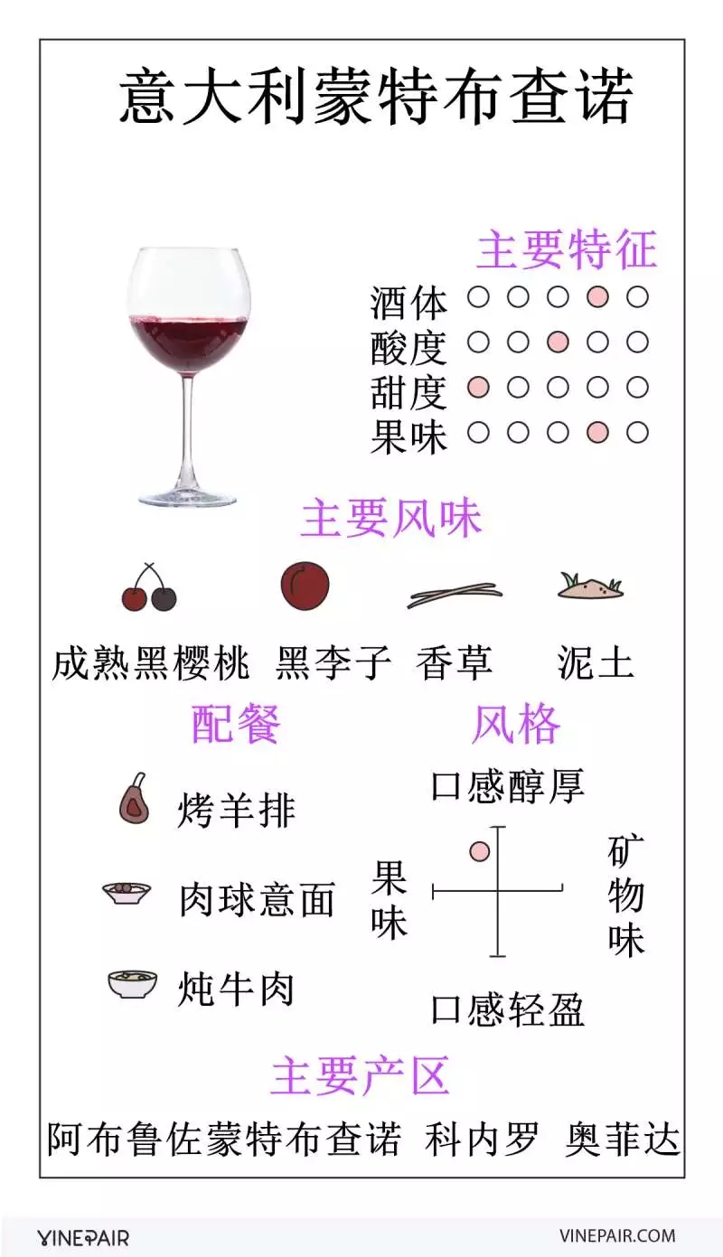 蒙特布查诺广泛种植于意大利中部,其酿成的葡萄酒风格平易近人,口感美妙,适合搭配多种美食。下面,跟小编一起来学习吧。
