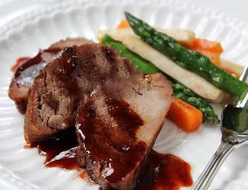 9. 将烤好的猪里脊斜着片成2cm 厚的圆片放在盘中,将炒好的蔬菜条搭配在一边,再将调制好的酱汁淋在肉片上即可。