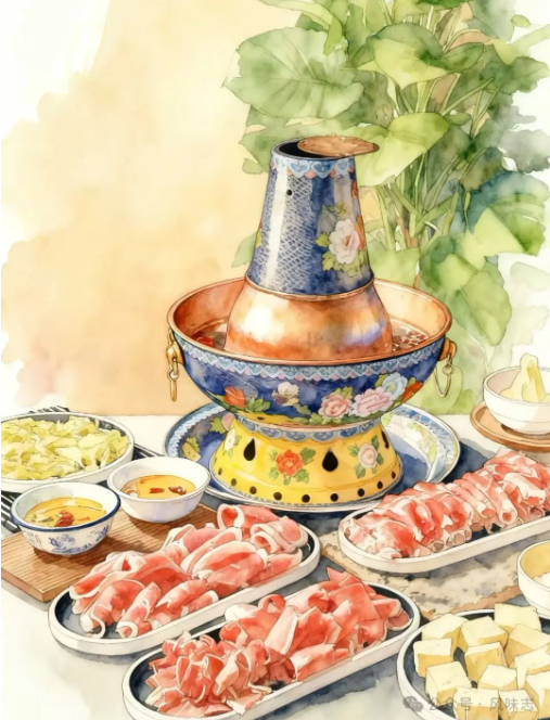 所以,老北京涮肉,根子其实在蒙古。元代,蒙古族“野炊火锅”随军传入中原:架铁锅,煮羊肉,蘸盐末。清代满人入关,吸收蒙古饮食,又融合宫廷礼仪,将粗犷的“蒙古锅”改良为紫铜炭火锅,汤底由白水变为清汤,蘸料由盐末变为麻酱,吃法由豪饮变为细品。