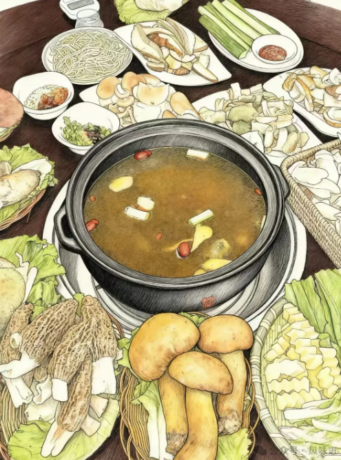 我在丽江古镇吃过一回。服务员把菌子火锅安置好之后并不上碗筷,只是在桌上放了一个计时器:“头二十分钟,谁也不准动筷子,锅盖不能揭,汤不能尝。”满屋人眼巴巴盯着锅,像在等一场神秘仪式的揭晓。待时间一到,众人纷纷举箸提勺,只觉菌肉滑嫩,汤头鲜得舌根发麻,仿佛吞下整片雨林的晨露与腐殖土的精华。