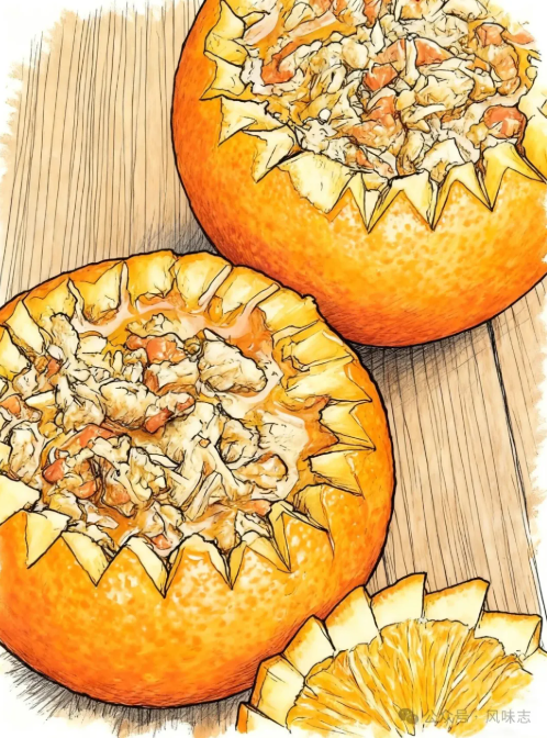 取大橙子,顶部切开,挖出果肉,留少许橙汁;蟹黄蟹肉加姜末、酒拌匀,填入橙中,盖上“橙盖”,上锅蒸十分钟。上桌时,橙香清雅,蟹鲜醇厚,酸甜与咸鲜在口中奇妙交融,既解腻,又提鲜。