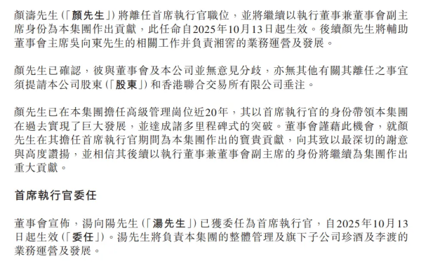10月14日,珍酒李渡公告称,汤向阳接替颜涛出任公司新任首席执行官(CEO)。