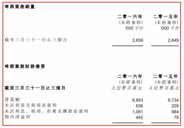对于一季度业绩表现,华润啤酒表示较2015年同期有显著改善,主要原因是淡季中档及以上啤酒销量增长带来营业额上升,同时原材料成本降低。另外,销售及分销费用在期内也有所下降。
