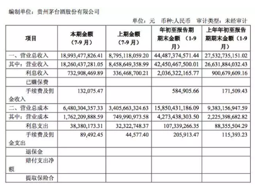 根据报告显示:第三季度(7-9月)茅台营收189.93亿元,同比去年增加超百亿元,同比增长超100%。