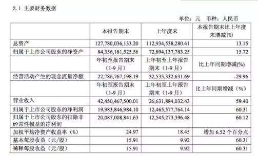 报告显示,茅台前三季度,贵州茅台共营收424.5亿元,同比增长59.40%;净利润199.84亿元,同比增长60.31%。