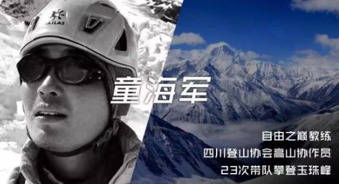 童海军是土生土长的青海人,是自由之巅的专业教练,也是四川登山协会高山向导,曾经23次带队攀上昆仑山东段最高峰——玉珠峰,先后完成过慕士塔格、阿尼玛卿、雀儿山、龙脊峰等山峰的攀登。