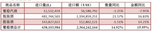 葡萄酒整体增长平稳。瓶装酒量额双增,但增幅有所收窄;散装酒量额互有涨跌;葡萄汽酒继续小幅走低。瓶装酒全年进口额21.95亿美元,同比增长16.8%,占葡萄酒进口总额的近93%。随着国内消费者对瓶装酒的认知度和接受度不断扩大、加深,瓶装酒的市场辐射面将更广,进口瓶装酒市场的进一步发展值得期待。