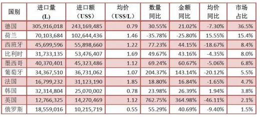 全年进口啤酒量6.5亿升,进口额6.7亿美元,同比分别增长20.1%和15.8%。德国、荷兰、西班牙仍为进口啤酒三大市场巨擘,其中,德国量额双增,荷兰降幅略有收窄,西班牙涨势喜人。值得一提的是,葡萄牙啤酒全年高开高走,进口量和进口额同比分别增长了2倍和1.4倍。无独有偶,英国啤酒更是一路高歌猛进,进口量和进口额同比分别增长了7.6倍和3.6倍。