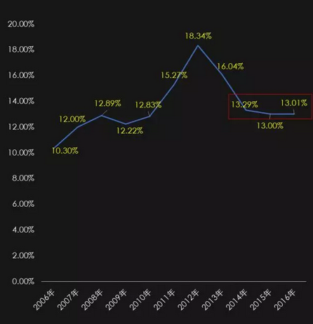 2014-2016年,行业净利润率都能维持在13%(利润率=净利润/营收*100%)。