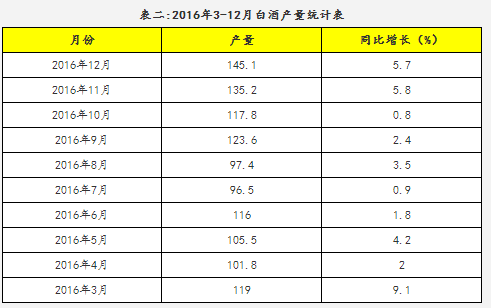 另一方面,2016年各月份白酒产量增幅有限。2016年12月白酒产量为145.1万千升,同比增长5.7%。1-12月以来,每月增幅有限,同比增长率也在个位数徘徊。