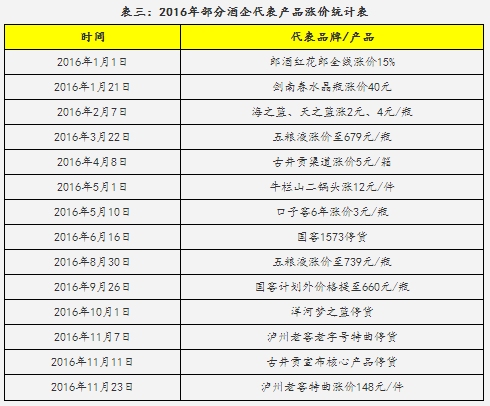 2016年以来,白酒市场纷纷刮起了一股涨价风。不仅一线酒企的名牌白酒基本都已开启了涨价模式,就连有些中端白酒也已经涨价或者是正在酝酿涨价。尤其是在国庆、中秋的时候,绝大部分的名酒都将价格调高了100到200元。节日过后,一线酒企们也不约而同的采取了停货、控货的方式来维持市场上的白酒价格,白酒全面提价已成趋势。
