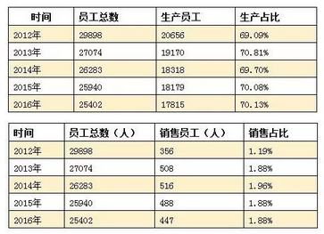 五年来,五粮液在人才结构上持续优化,但生产员工始终保持在70%较高的稳定水平,这是品质稳定的基础;对比2016年和2012年发现:虽然少了近三千生产员工,但产能却多了一万吨。另外销售员工的占比偏低……