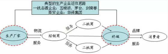 “在商言商”,以商贸单元为基础的酒水产业链条,主要由三个环节构成,分别是上下游关系的生产企业单元、商贸企业单元和销售终端单元。商贸企业的产业链价值思考,就是由商贸单元向生产单元与终端单元的不断整合推进。