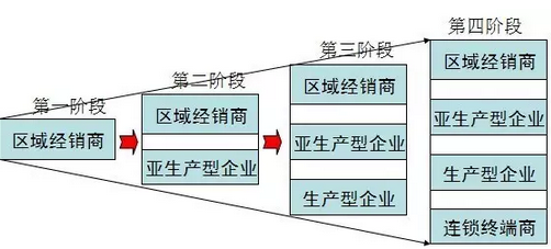 酒水区域性商贸企业,是产业链中最原始的商业环节,也是最基础的商业存在形式。区域性商贸企业是最有可能发育出一体两翼商战略模式的单元,因为区域深耕的复杂性和需要花费大量的时间做基础,难以复制。而区域性商贸企业最有可能的一体两翼商战略模式路径要走这样四个阶段。第一阶段,标准区域经销商阶段,经销商在小区域内进行商业活动,履行其分销职能,构建区域一体商。第二阶段,区域经销商开始进行专销产品开发,向厂方职能推进,在区域一体商基础上迈向品牌运营商单元。第三阶段,进入生产企业领域,完全实现品牌自主及市场运作自主。第四阶段,发展连锁终端,实现终端职能介入。