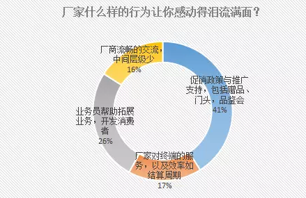 在微酒的调查中,厂家的政策打动了41%的终端,其次是业务员帮助开拓业务、开发消费者;然后是厂家对终端的服务,以及办事效率和厂商流畅的交流。