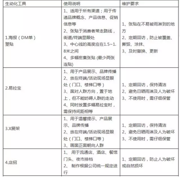 1、生动化是指通过有效的环境规划、气氛营造、商品陈列等手段使产品在终端更加能吸引消费者眼球,刺激消费者的购买欲望,最终促成消费者购买,实现整体销售的迅速提升,这就是为什么诸多企业高度重视终端生动化陈列的原因。生动化具体如下表。