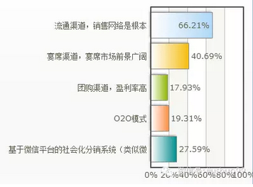 经销商在回答“您认为未来3~5年要想把酒水生意做好,最重要的是把那个渠道(或模式)建立好?”时,66.21%的经销商认为流通渠道价值最大,认为搭建起健康的销售网络是顺利分销的基础,明显不同于两年前经销商普遍重视团购渠道的情况。有40.69%的经销商看重宴席市场的价值,由此可见,未来,酒类产品在宴席市场的争夺战还将持续升级。27.59%的经销商认为需要建立一套社会化分销系统,比如微商系统,培育新的销售渠道。这一比例并不高,笔者分析认为,这与白酒行业比较传统的特征有关,也与经销商对于社会化分销系统的理解不够深入有关。仅有19.31%的经销商认为在未来的发展中,O2O模式是重要的环节,对比2013年,经销商对于O2O的关注度大幅下降。