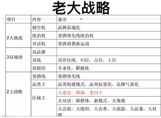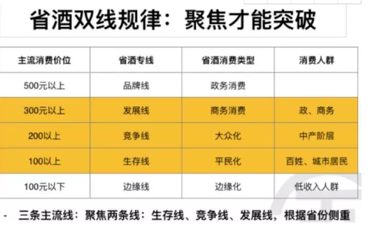 具体说来就是, 省酒领先线再聚焦,100元以上如果你做不好,生存就会有问题。200元上下的这仗打赢了,你在当地就是老大。300元上下你也占领了,你未来十年都是老大,因为你能够持续发展。500元以上,有你的核心形象产品,那么你就掌握了制空权。